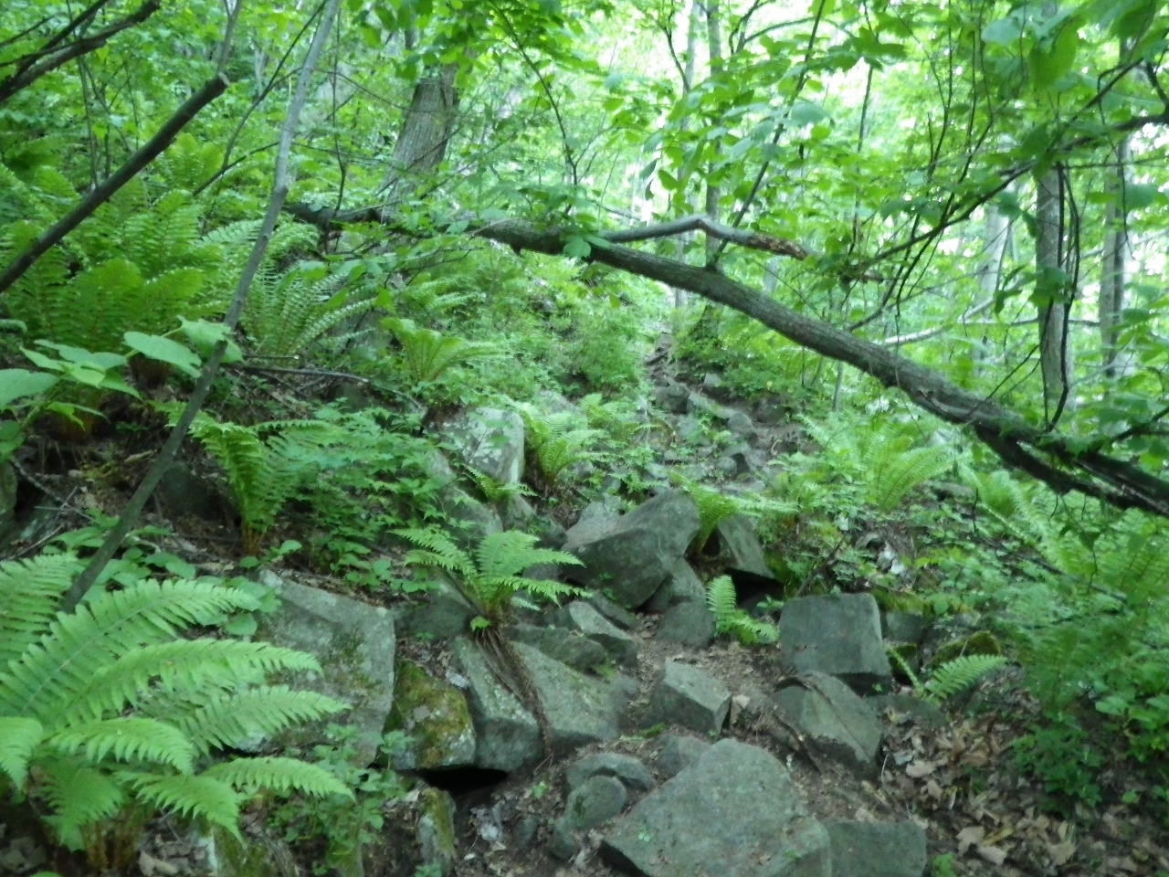 最初は急な坂と地面の乾いた森が続きますが、しばらく進むとシダの群生したポイントに。倒木を潜り岩ごつごつ道を進みます。道は急で、木の根や岩を手がかりによじ登ることもしばしば。友人は二本足だけでサクッと登っていましたが……
