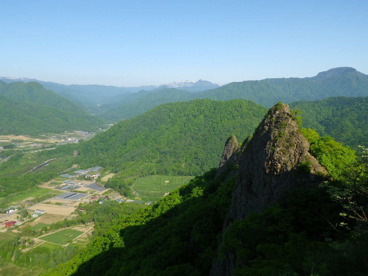 おそらく眼下に見える森がさっき岩山を見上げた地点ですね。写真の上部には麓の民家、右上には豊平川が映っています。