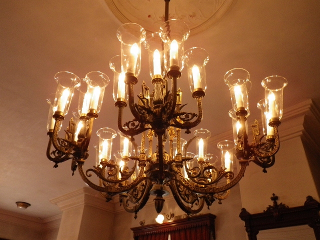 シャンデリアは部屋によってモチーフが違い、天井に掘られた模様も部屋によって花とか鳥とか。