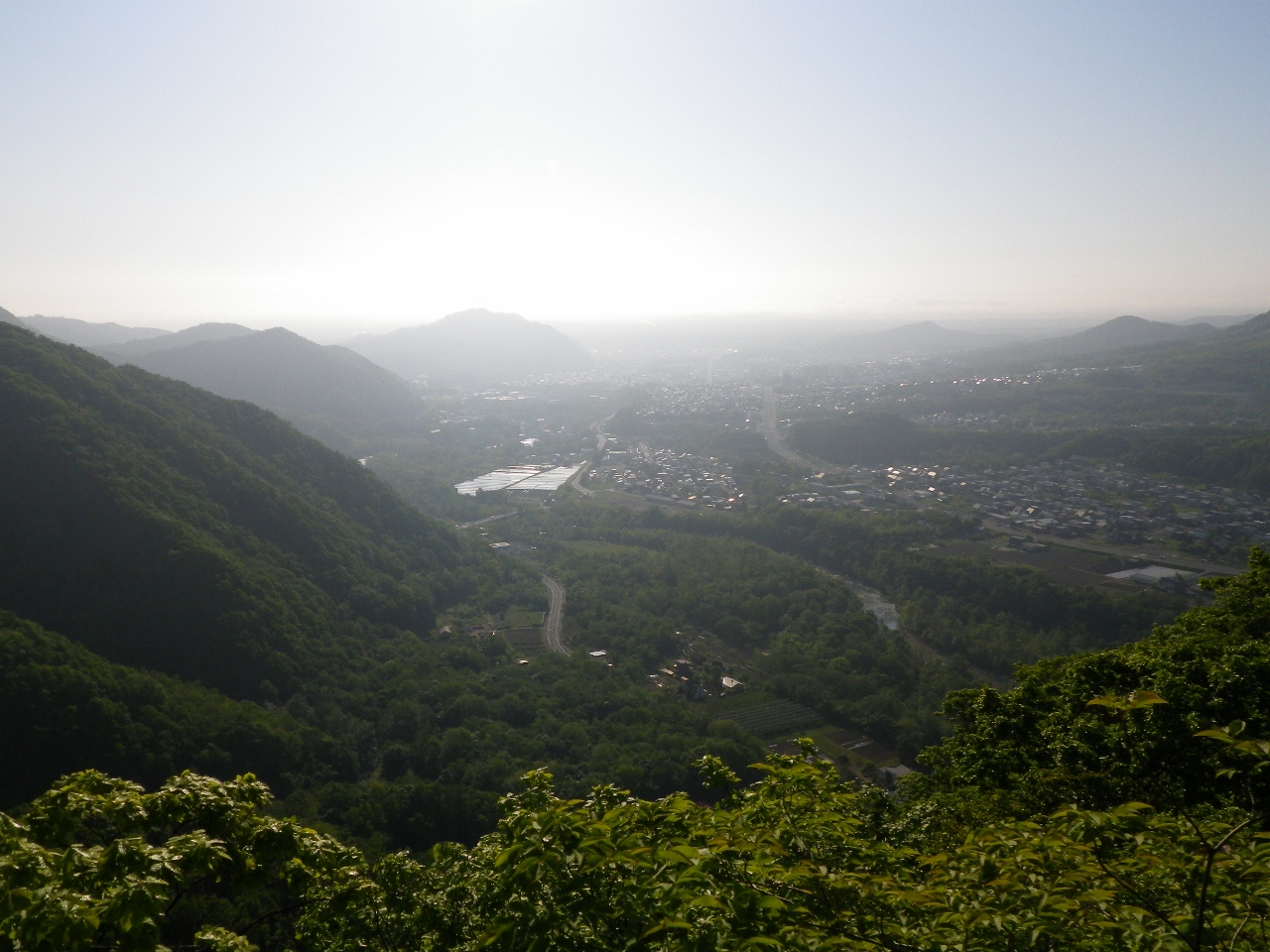 おそらく眼下に見える森がさっき岩山を見上げた地点ですね。写真の上部には麓の民家、右上には豊平川が映っています。
